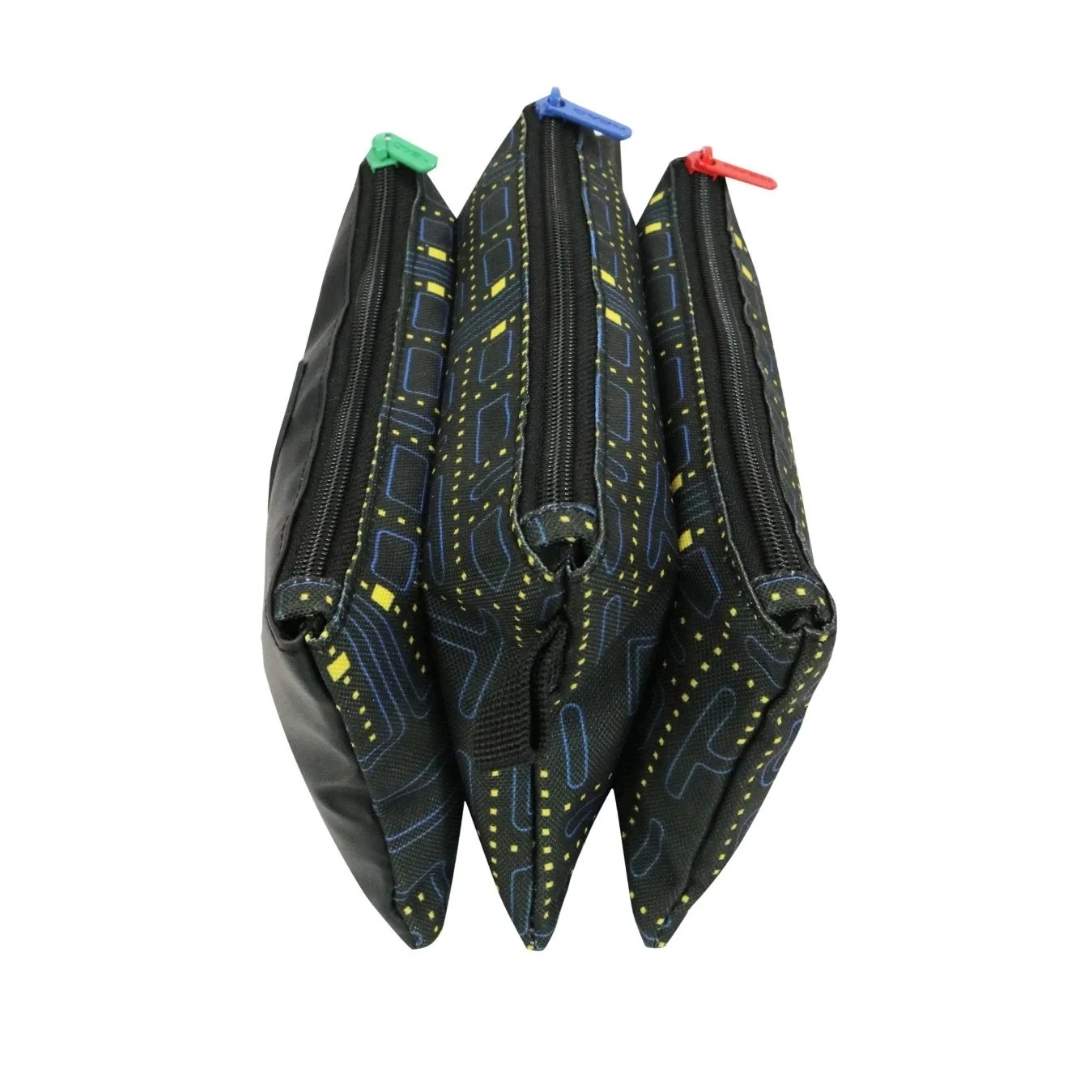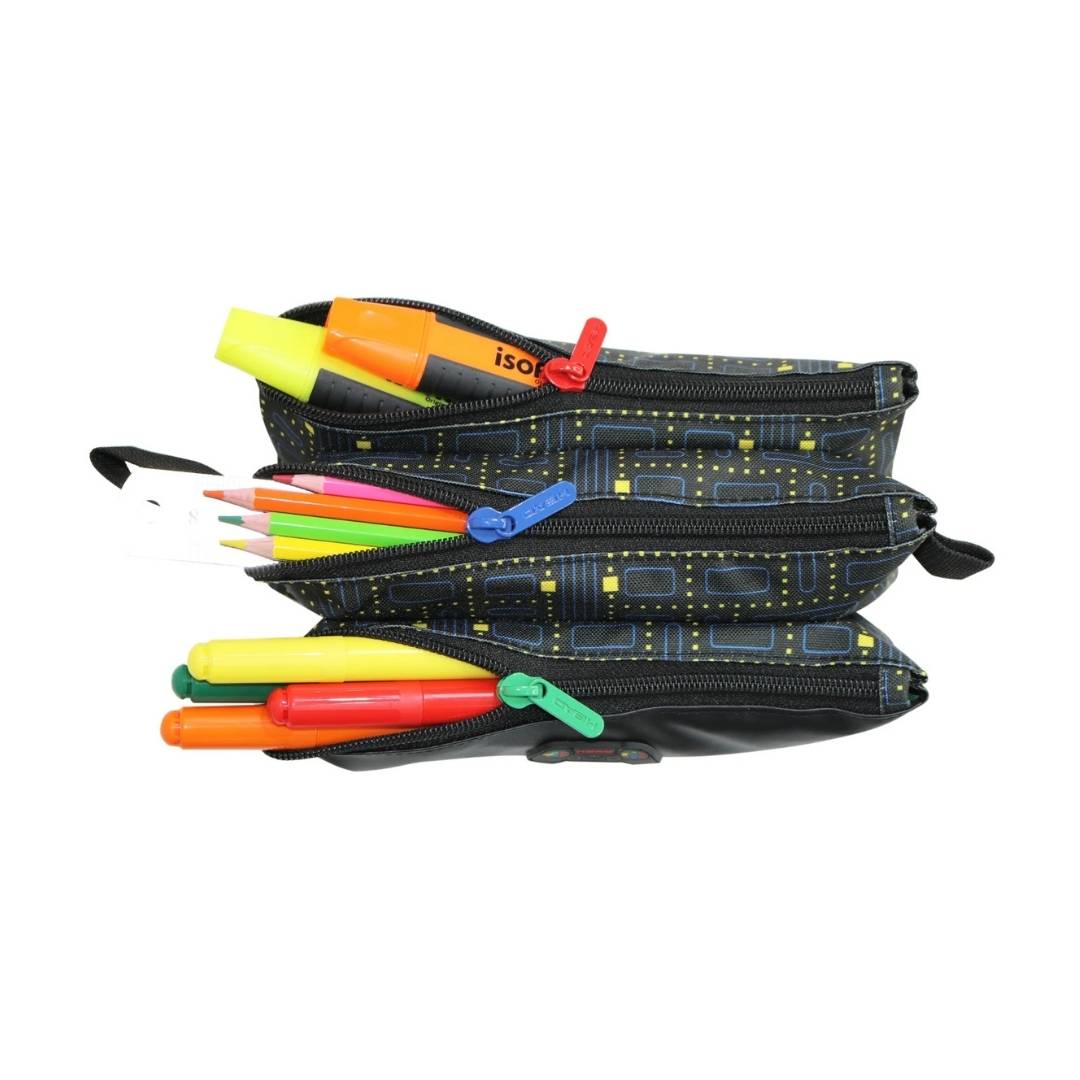 Estuche de tres compartimientos de carácter infantil y juvenil, con diseños en base a color plano y telas estampadas.