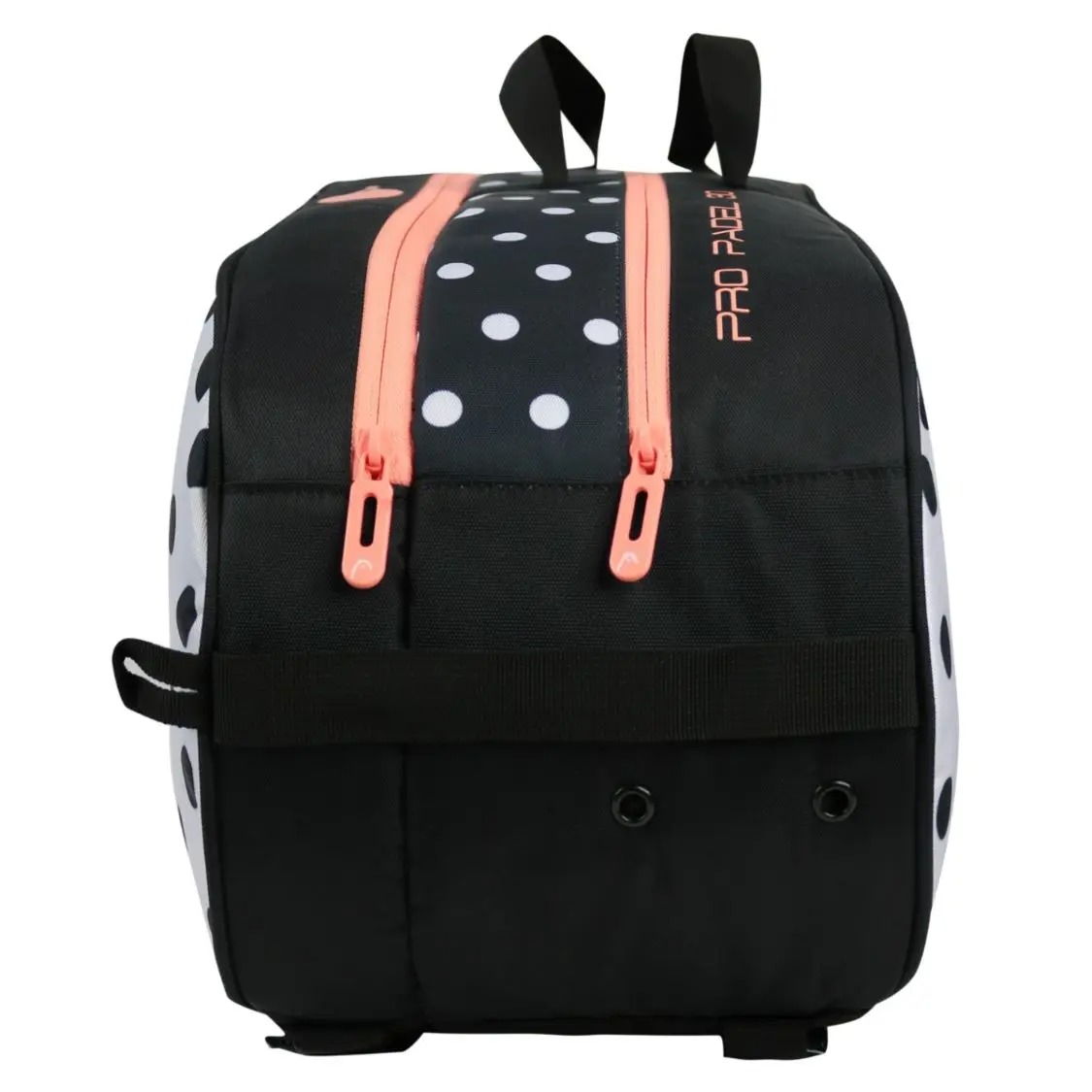 Cuenta con un bolsillo lateral de fácil acceso para guardar tu teléfono, llaves, dinero o lo que necesites tener a la mano. ProPadel 30 de Head cuenta con tirantes ajustables ergonómicos acolchados multifuncionales, que se pueden utilizar como bolso o mochila para llevar en la espalda, además de sus asas en la parte superior como en el frente para mayor facilidad de manejo. Es un bolso paletero hecho con los mejores materiales pensado en el padel, dando como resultado un peso cercano a 500 gramos en total y una capacidad de hasta 30 litros.