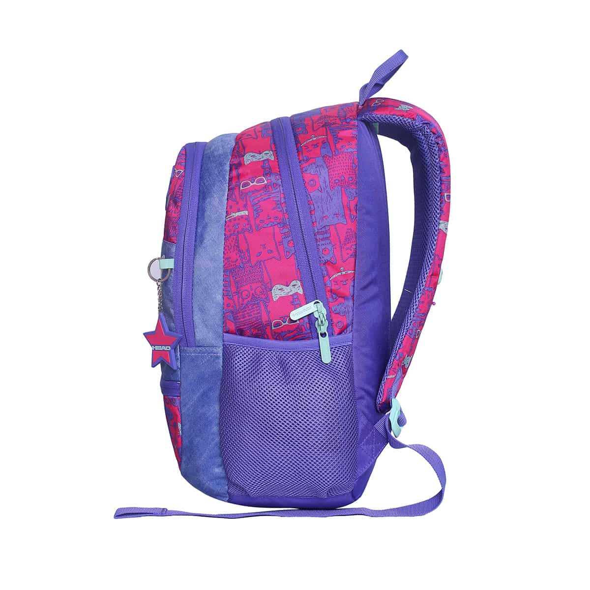 Mochila diseñada para niños, con aplicaciones y estampado en el panel frontal. Tiene dos compartimentos amplios y un bolsillo frontal, cuenta con porta botellas lateral.