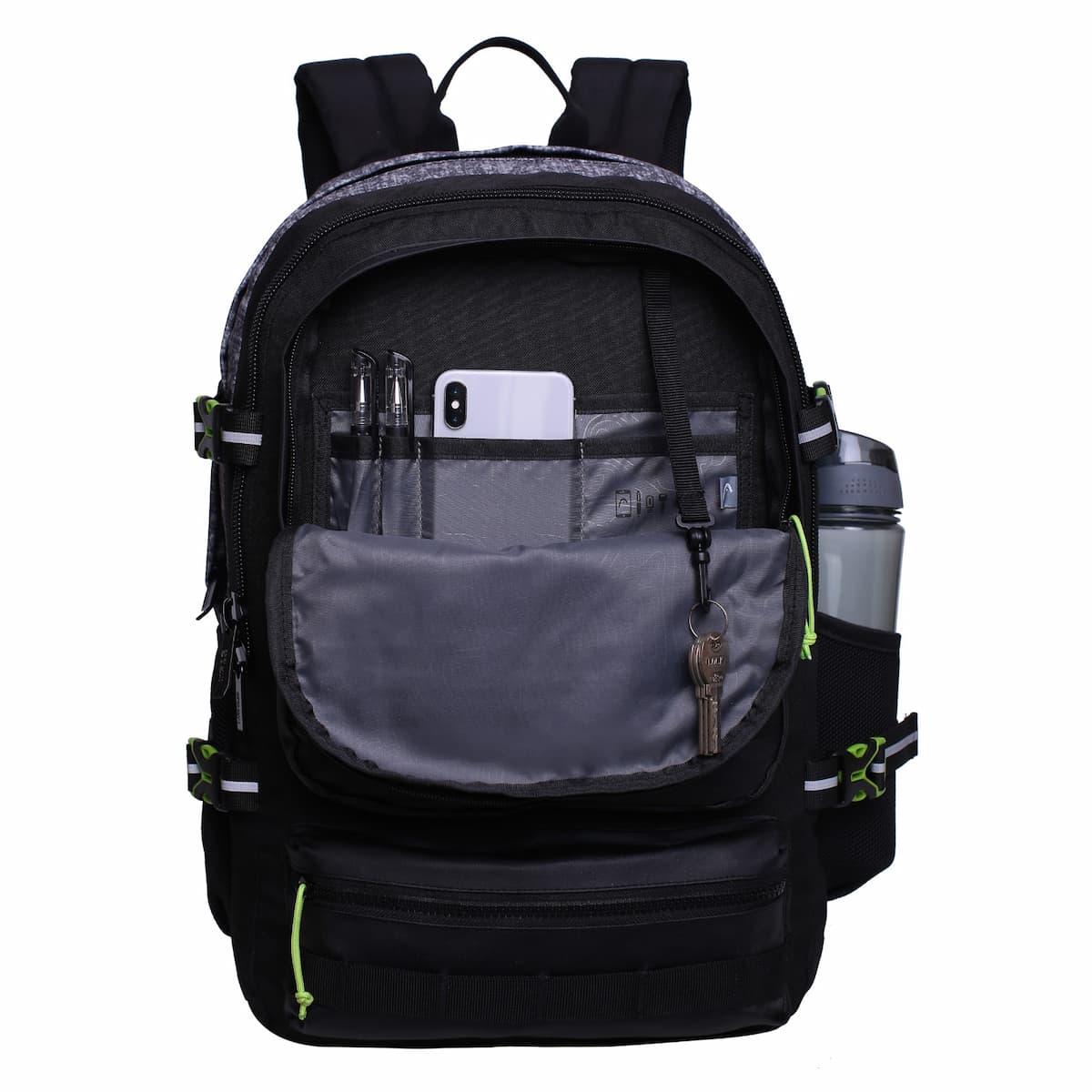 Es una mochila de 40 litros, presenta dos amplios compartimentos de gran capacidad, bolsillo de malla interior, 2 bolsillos frontales independientes de fácil acceso, 2 bolsillos laterales para botellas y su compartimento principal tiene un bolsillo para tu computador de hasta 15.6″.